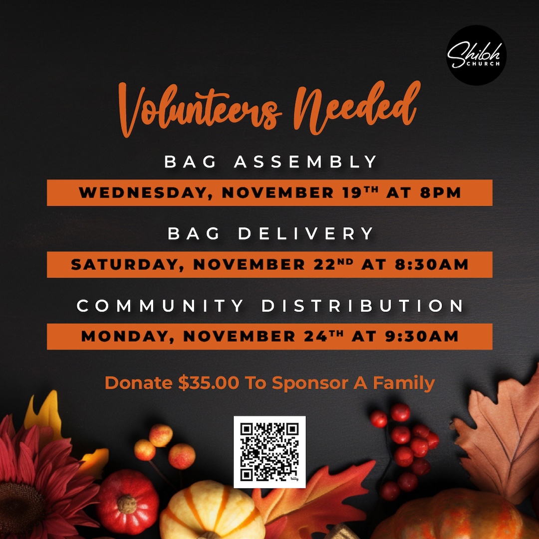 Shiloh Church has been blessed beyond measure, and we love to give back to our amazing community! This year our target is to give away 2500 Thanksgiving food bags.  We will assemble the bags on Wednesday, November 19 at 8:00 PM (Men, Women, Marriage, Impact).  The Baskets of Blessing Delivery will be on November 22.  The Thanksgiving Food Giveaway will be on November 24.