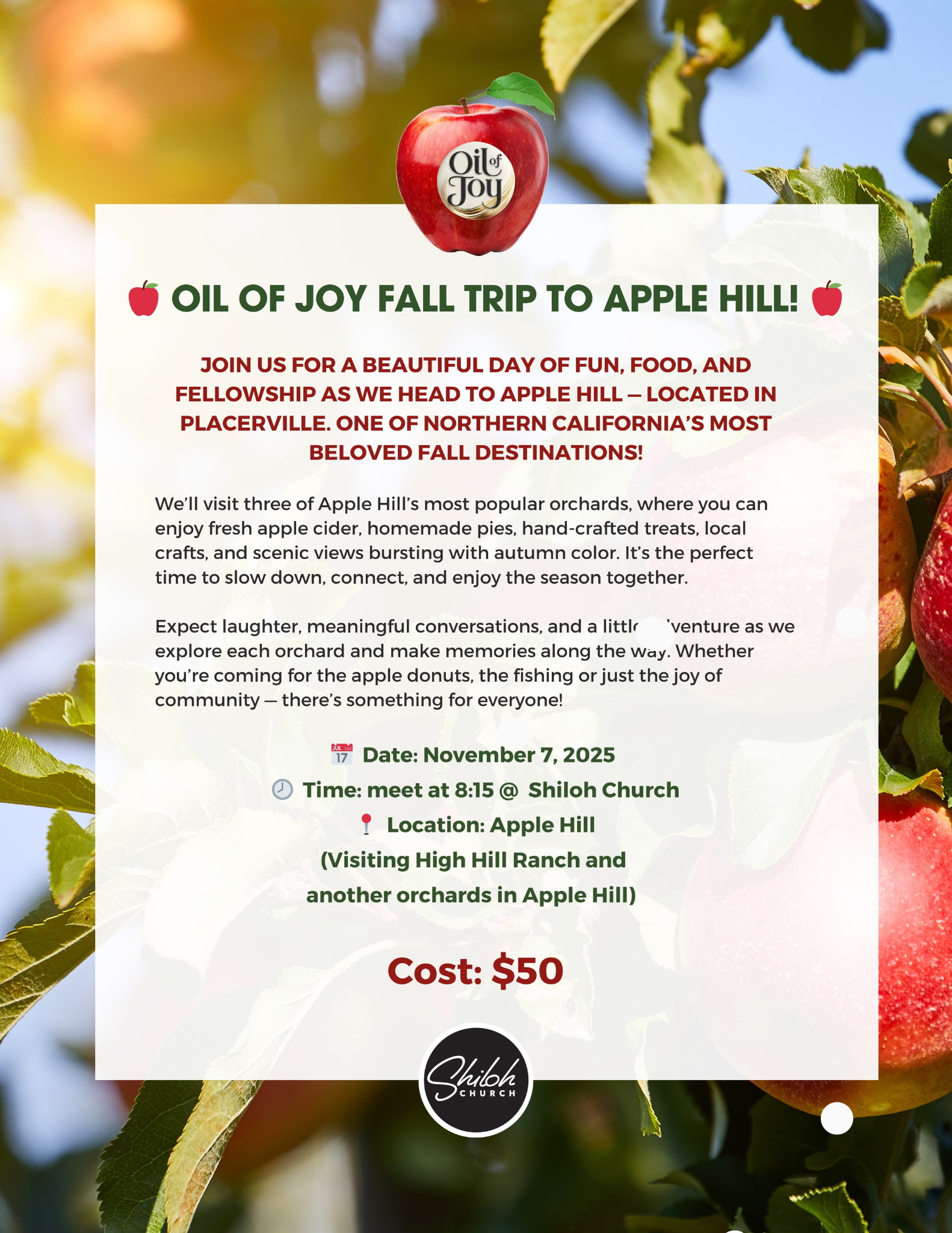 Come enjoy a refreshing day at Apple Hill filled with friendship, laughter, and the beauty of fall! Stroll through the orchards, sip fresh cider, browse local crafts, try a little fishing, and of course—enjoy plenty of delicious apples! It’s the perfect day to relax, connect, and make new memories together.