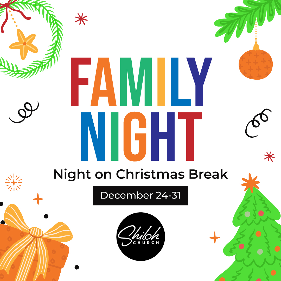 Shiloh Family Night will be on break for the Christmas Holiday.  Have a blessed celebration with your family. Classes will resume on January 8.