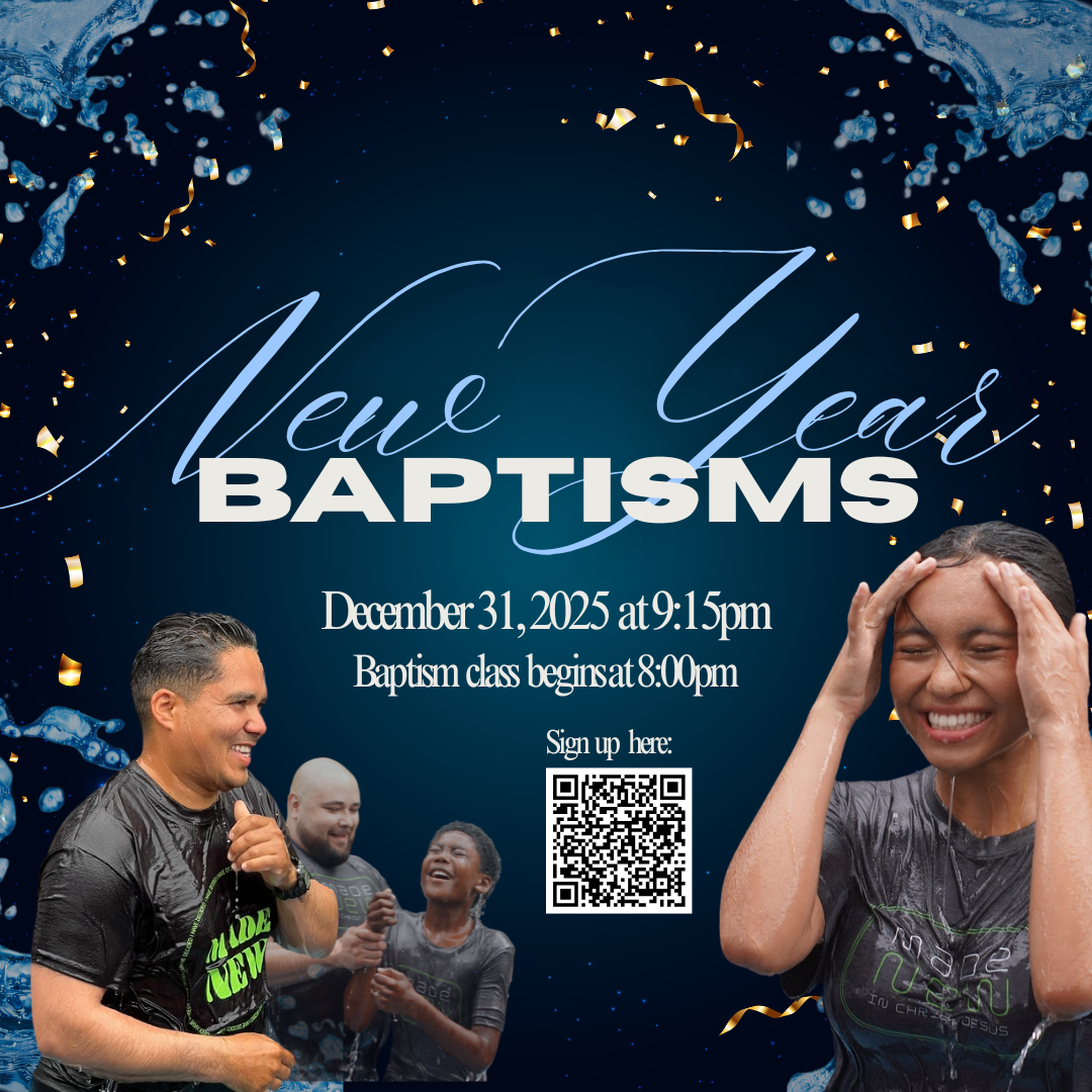 Out with the Old and in with the New! Declare a fresh start for the New Year by getting baptized. The class will be at 8:00 PM and the Baptisms will be at 9:15 PM.
