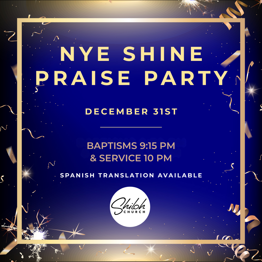 Shiloh Church is having PARTY for New Year’s Eve!  We invite you to a spirit-filled evening of praise to ring in the New Year. The celebration begins with baptisms at 9:30 PM, the service at 10:00 PM followed by the afterparty at 12:00 AM. And we shall get MORE UNDIGNIFIED THAN THIS!! Spanish translation available.